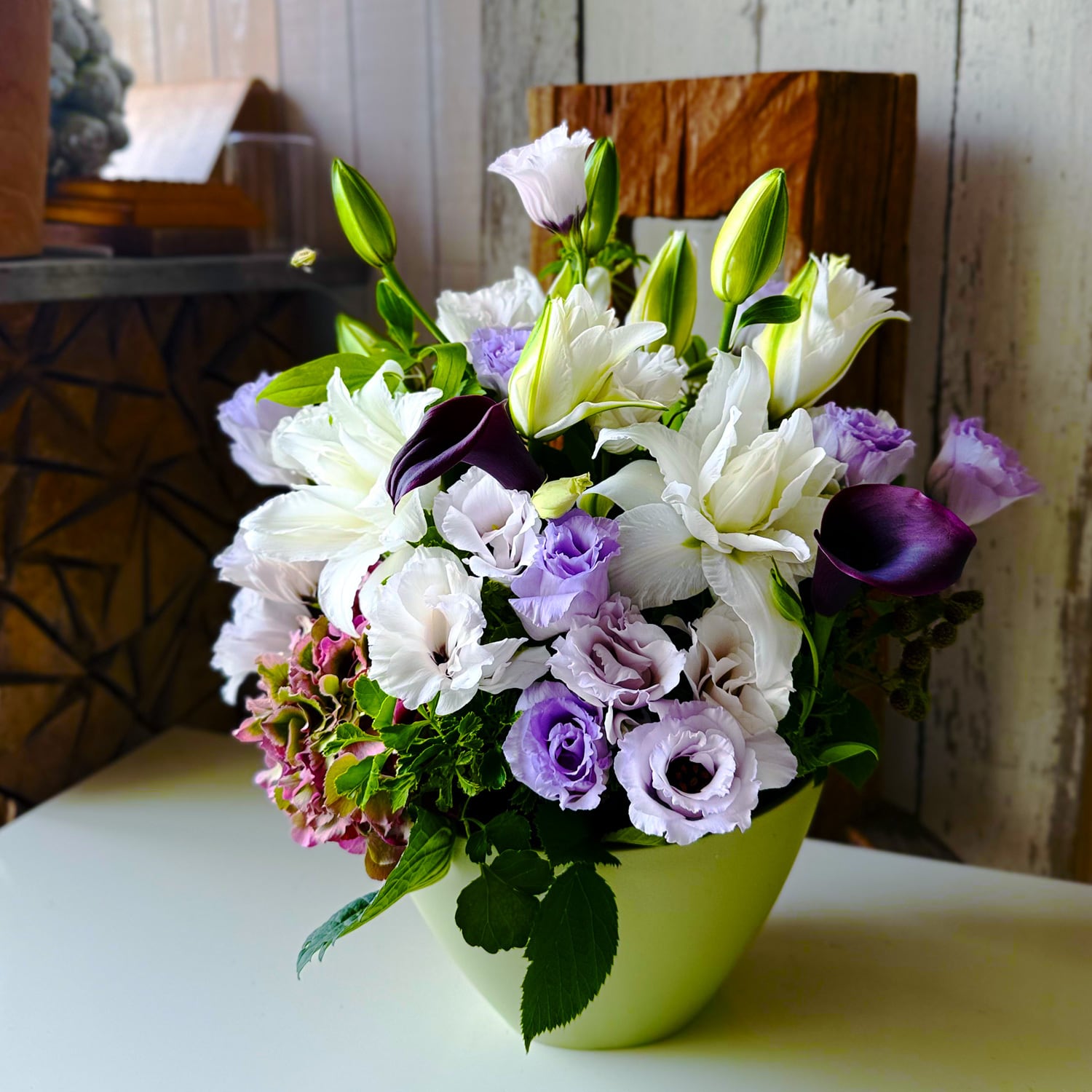 白百合の気品、トルコキキョウの柔らかさ、そして深みのあるカラーのアクセントが、心を静かに包み込みます。