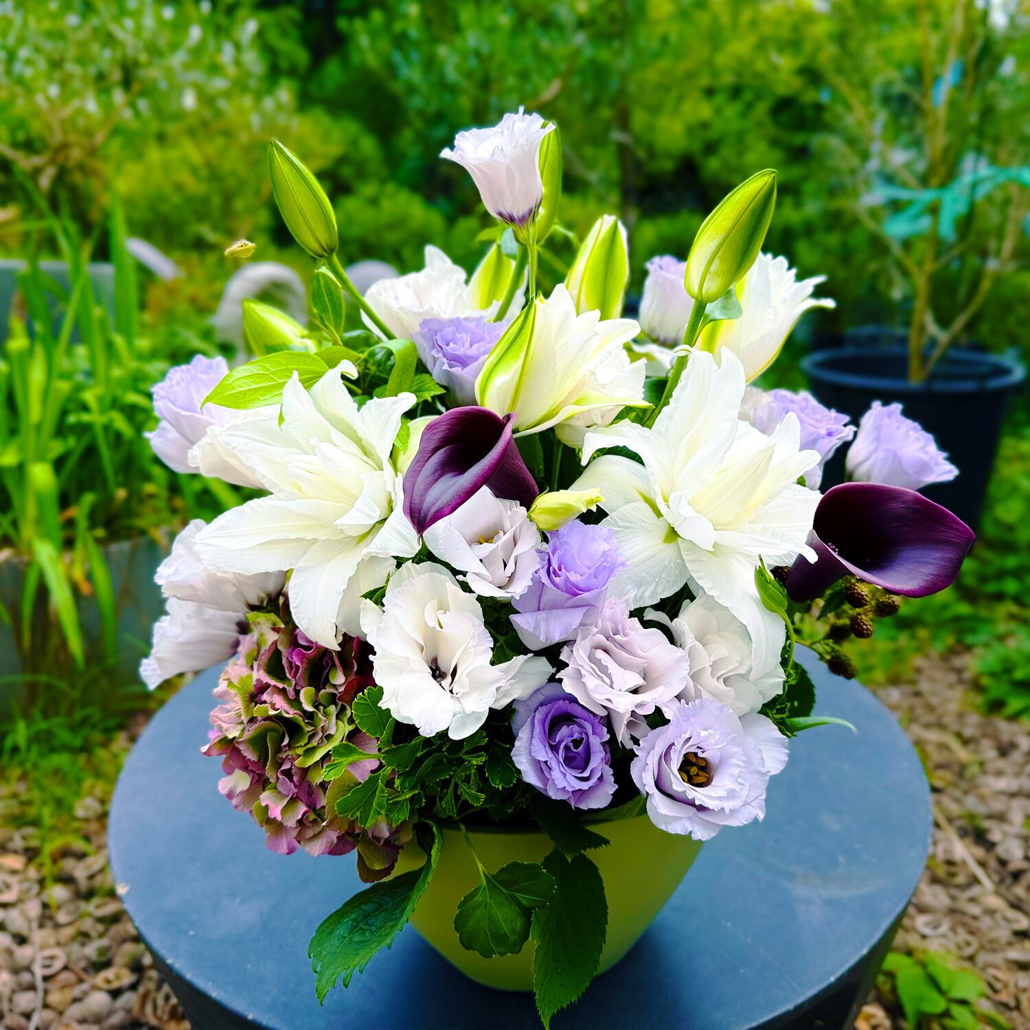 #お供え花 #供花アレンジメント #法事の花 #お盆花 #フラワーアレンジメント #紫の花 #白百合 #トルコキキョウ #紫香の祈り