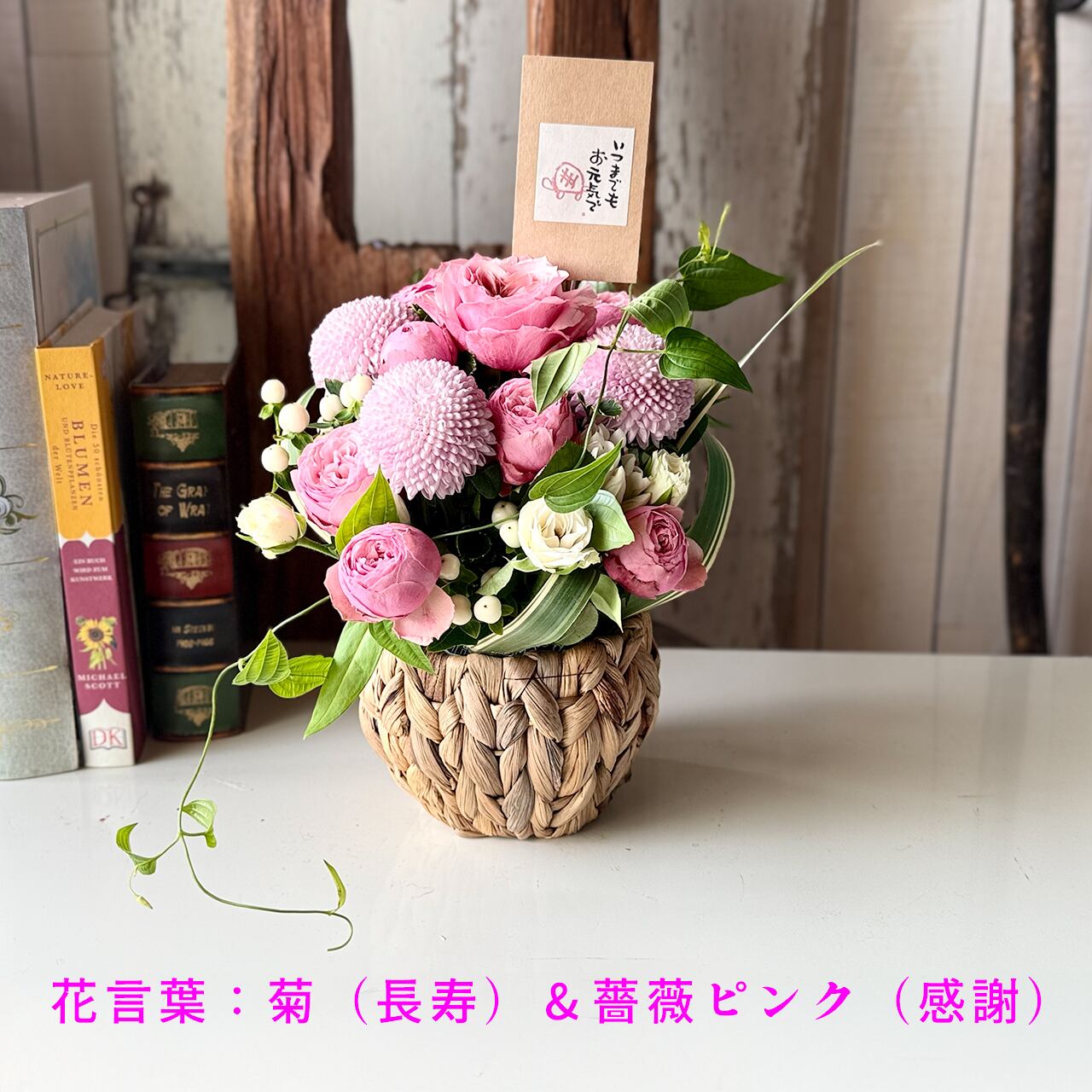 優しいピンクのバラやまんまるの菊を合わせた、上品で可愛らしい敬老の日限定アレンジメントです。
