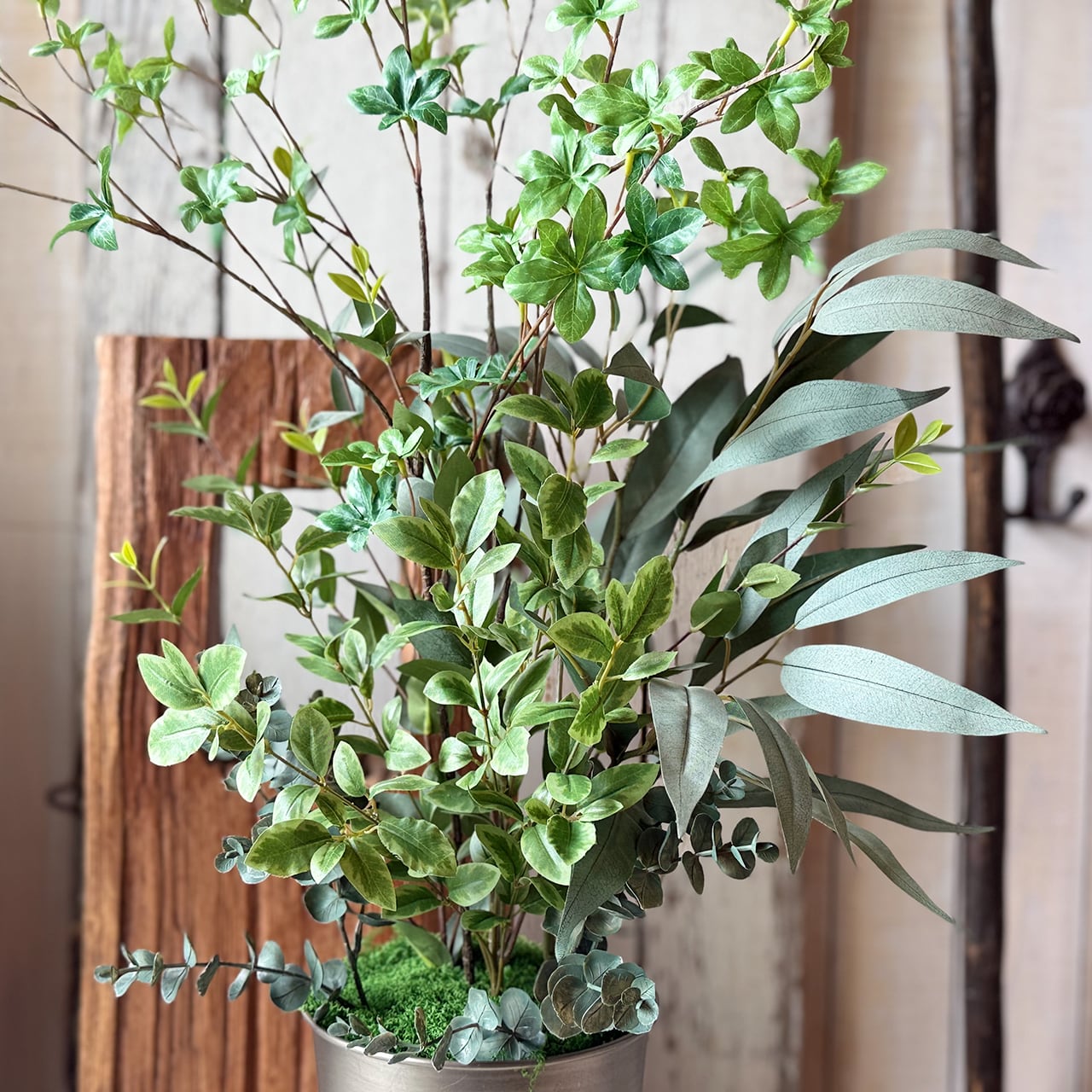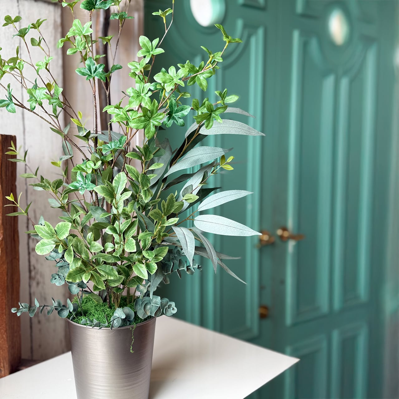 艶を抑えたメタルポットと立体的な枝葉のバランスが美しく、