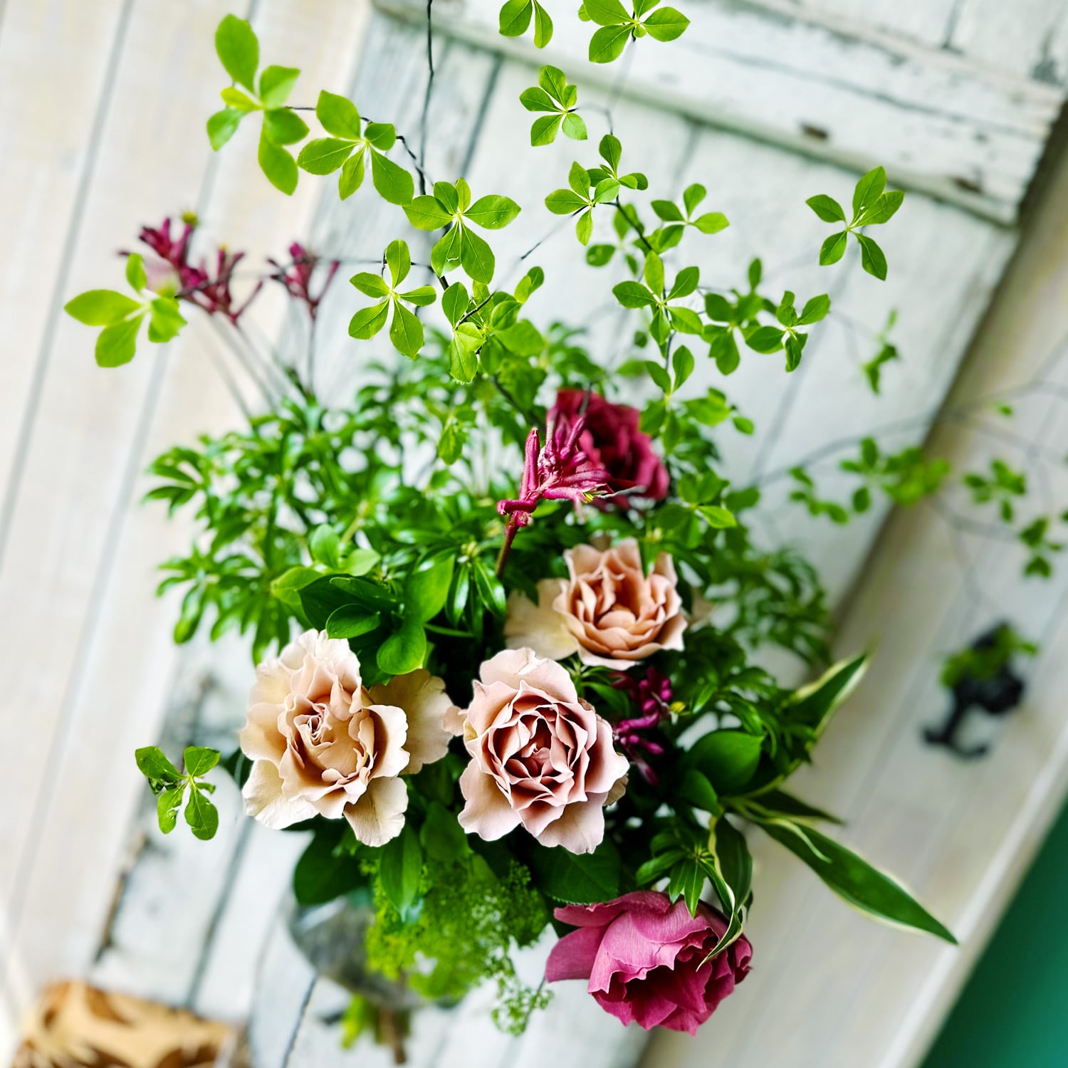 アマゾンオリーブ、ドウダンツツジ、ノバラ、グリーンアナベル、ユーカリ、ルドベキア、クルクマ